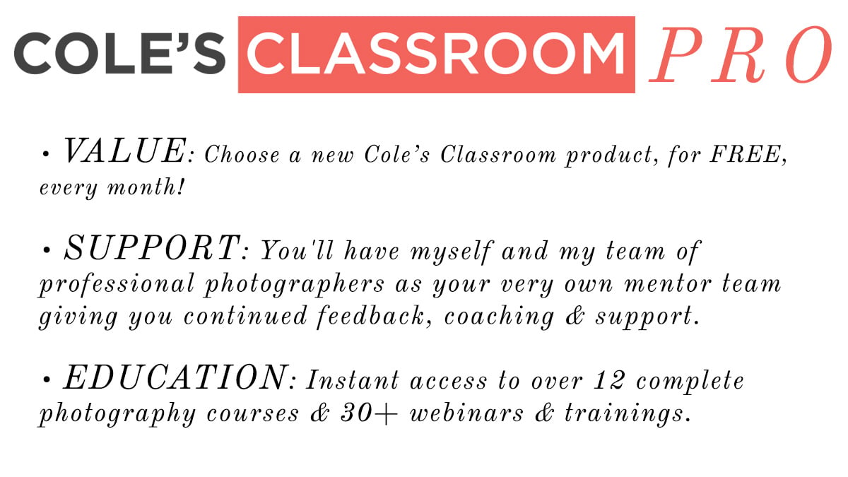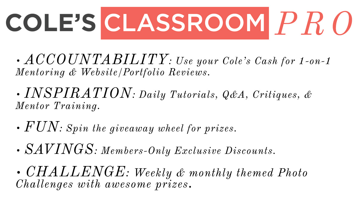 Cole's Clique has been created to be your home-base for answers, guidance, support & learning photography in a way that simply doesn't exist anywhere else on the web. Trust me - I've looked.